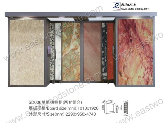 This type of stone slab racks looks like a big "book" page, when you in front of this display, you can easy to turn it from one page to another page. It is very suitable for big tiles displaying for granite and marble slab. So for the stones (especially marbles),which need to be presented by a big piece like 240x120cm for whole looking with amazing affection, they will be displayed by this kind of Page-Type Slab display Racks.